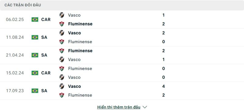 Thành tích đối đầu của Fluminense vs Vasco da Gama