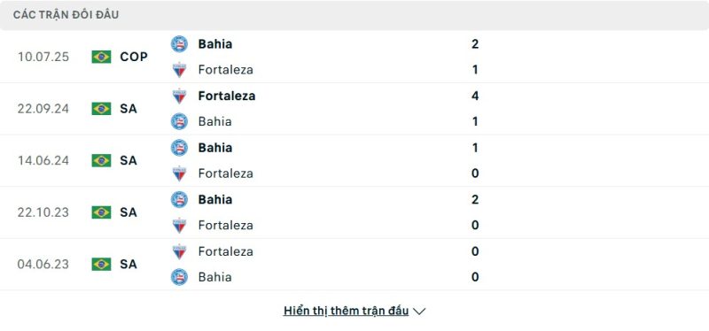 Thành tích đối đầu của Fortaleza vs Bahia