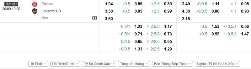 Bảng Tỷ lệ kèo bóng đá Girona vs Levante