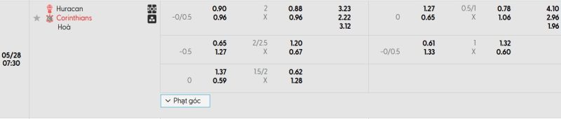 Bảng Tỷ lệ kèo bóng đá Huracán vs Corinthians