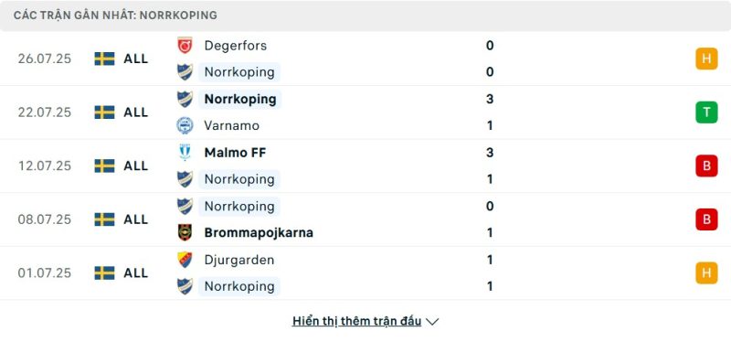 5 trận gần nhất của IFK Norrköping: D-W-L-L-D