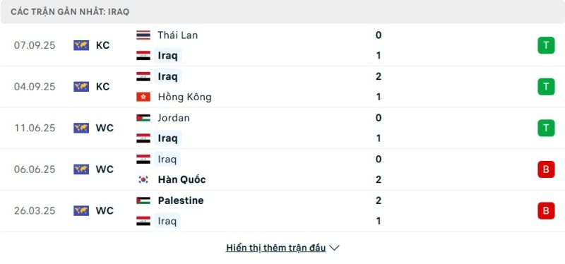 5 trận gần nhất của Iraq: W-W-W-L-L