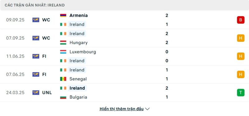 Thống kê phong độ gần đây Ireland vs Armenia