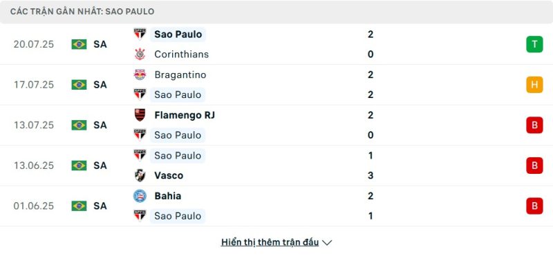 5 trận gần nhất của São Paulo: W-D-L-L-L