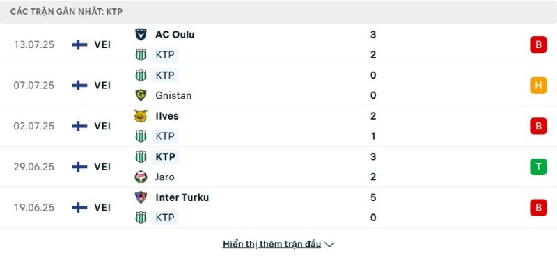Thống kê phong độ gần đây KTP vs Inter Turku