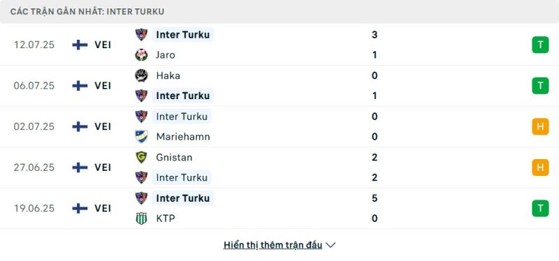 Inter Turku đang thể hiện một bộ mặt cực kỳ ấn tượng. Sau trận hòa không bàn thắng trước IFK Mariehamn, họ đã trở lại mạnh mẽ với chiến thắng 1–0 trước Haka và gần nhất là thắng lợi 3–1 trước FF Jaro. Đội bóng này duy trì chuỗi bất bại trong 15 vòng liên tiếp, qua đó củng cố vị trí trong top đầu bảng xếp hạng. Với sự ổn định trong cả tấn công lẫn phòng ngự, Inter Turku trở thành một trong những ứng cử viên hàng đầu cho chức vô địch năm nay.