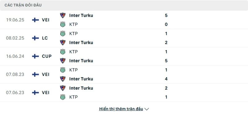 Thành tích đối đầu của KTP vs Inter Turku