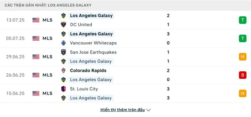 5 trận gần nhất của LA Galaxy: W-W-D-L-D