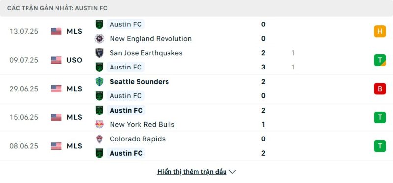 5 trận gần nhất của Austin FC: D-D-L-W-W