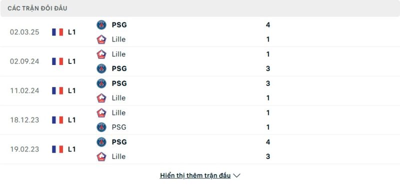 Thành tích đối đầu của Lille vs Paris Saint-Germain