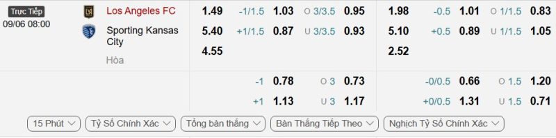 • Kèo tỷ số bóng đá hiệp 1: Los Angeles FC 2-0 Sporting Kansas City
