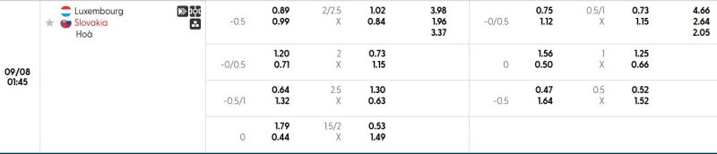 Bảng Tỷ lệ kèo bóng đá Luxembourg vs Slovakia