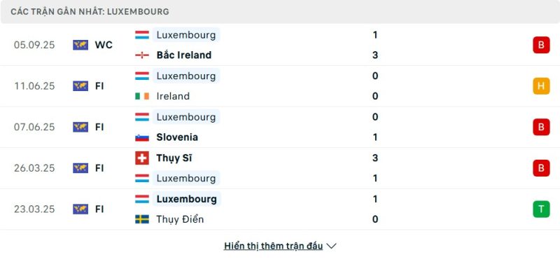 5 trận gần nhất của Luxembourg: L-D-L-L-W