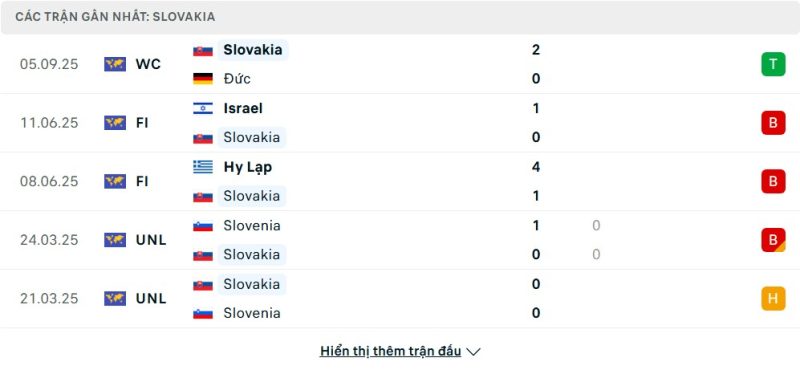 5 trận gần nhất của Slovakia: W-L-L-D-D