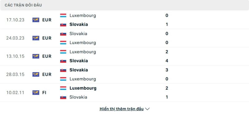 Thành tích đối đầu của Luxembourg vs Slovakia