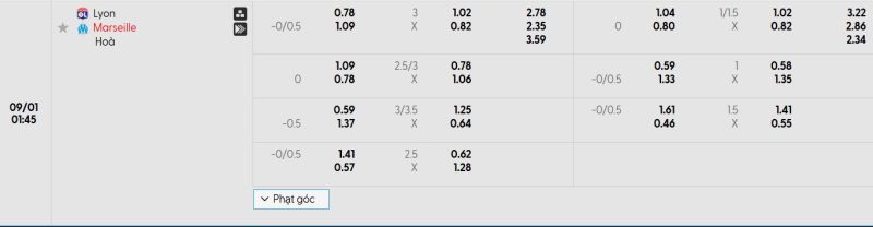 Bảng Tỷ lệ kèo bóng đá Lyon vs Marseille