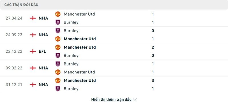 Thống kê phong độ gần đây Manchester United vs Burnley