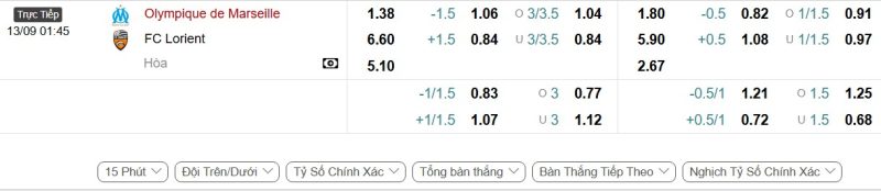 - Kèo tỷ số bóng đá hiệp 1: Marseille 0-1 Lorient