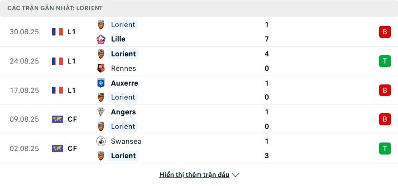 5 trận gần nhất của Lorient: L-W-L-L-W