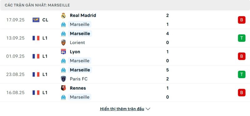Thống kê phong độ gần đây Marseille vs Paris Saint-Germain