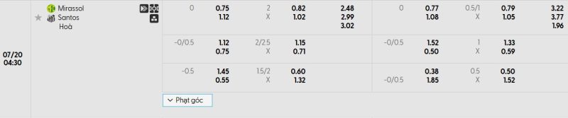 Bảng Tỷ lệ kèo bóng đá Mirassol vs Santos