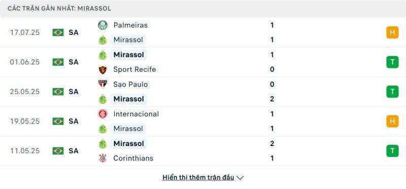 Mirassol bước vào vòng 15 với tâm thế đầy tự tin. Trong 5 vòng gần nhất tại Serie A, họ bất bại và thắng đến 3 trận, bao gồm các chiến thắng ấn tượng trước Corinthians, Sao Paulo và Sport Recife. Lối chơi của Mirassol ngày càng ổn định và hiệu quả. Họ vừa cầm hòa Palmeiras ngay trên sân khách, một kết quả tích cực trước đối thủ rất mạnh. Vị trí thứ 11 trên bảng xếp hạng phản ánh đúng đà tiến bộ của đội bóng này, đặc biệt là khi họ luôn tận dụng rất tốt lợi thế sân nhà.