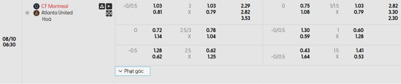 Bảng Tỷ lệ kèo bóng đá CF Montréal vs Atlanta United