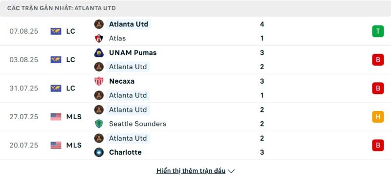 5 trận gần nhất của Atlanta United: W-L-L-D-L
