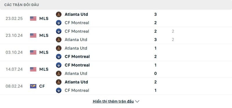 Thành tích đối đầu của CF Montréal vs Atlanta United