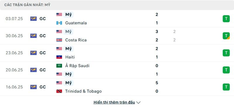 5 trận gần nhất của Mỹ: W-D-W-W-W