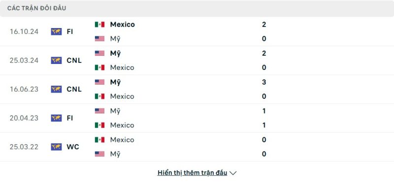 Thành tích đối đầu của Mỹ vs Mexico
