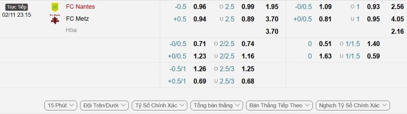 Bảng Tỷ lệ kèo bóng đá Nantes vs Metz