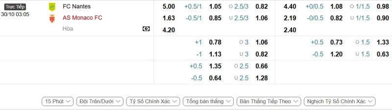 Bảng Tỷ lệ kèo bóng đá Nantes vs Monaco