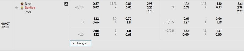 Bảng Tỷ lệ kèo bóng đá Nice vs Benfica