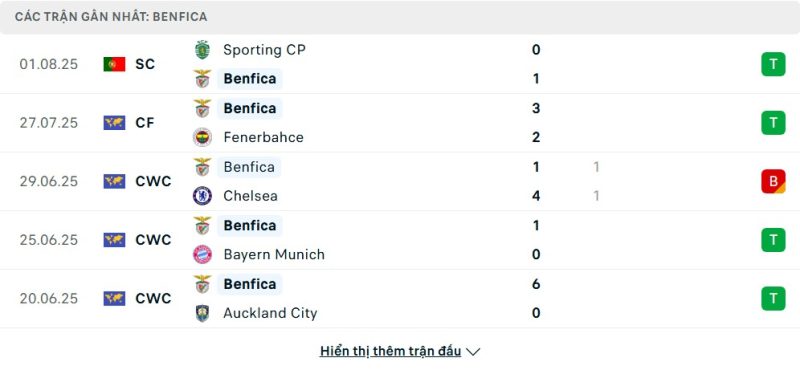 5 trận gần nhất của Benfica: W-W-D-W-W