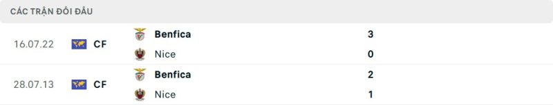 Thành tích đối đầu của Nice vs Benfica