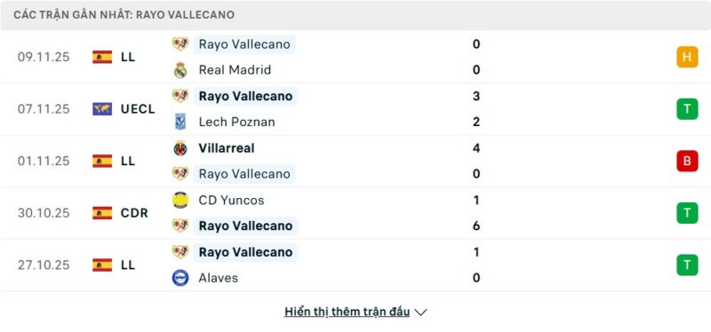 5 trận gần nhất của Rayo Vallecano: D-W-L-W-W