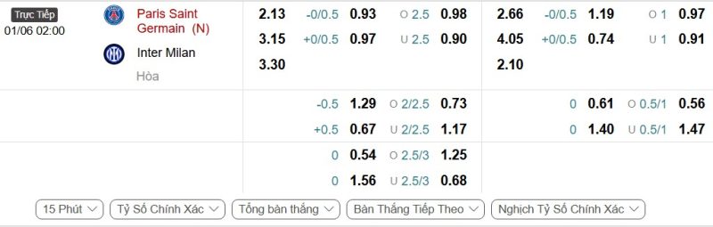 - Kèo tỷ số bóng đá hiệp 1: Paris Saint-Germain 0-0 Inter