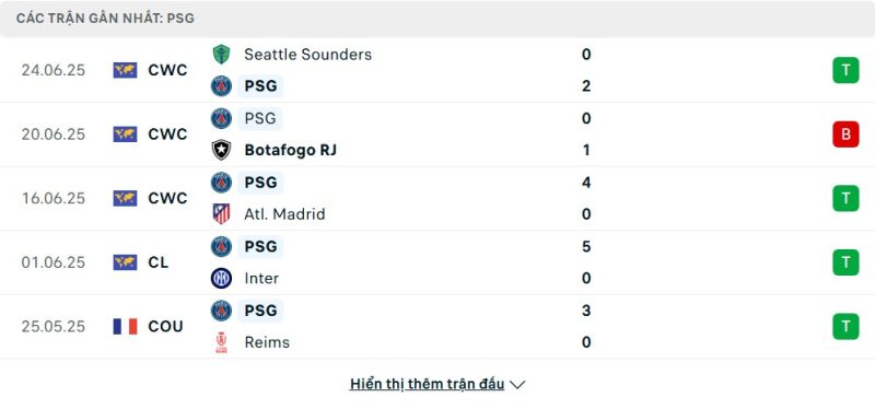 Thống kê phong độ gần đây Paris Saint-Germain vs Inter Miami CF