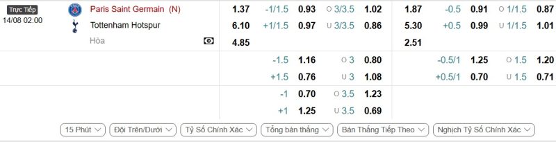 - Kèo tỷ số bóng đá hiệp 1: Paris Saint-Germain 3-0 Tottenham Hotspur