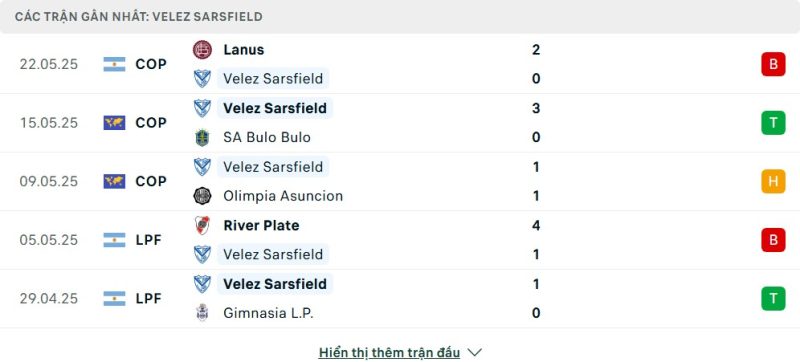 5 trận gần nhất của Vélez Sarsfield: L-W-D-L-W