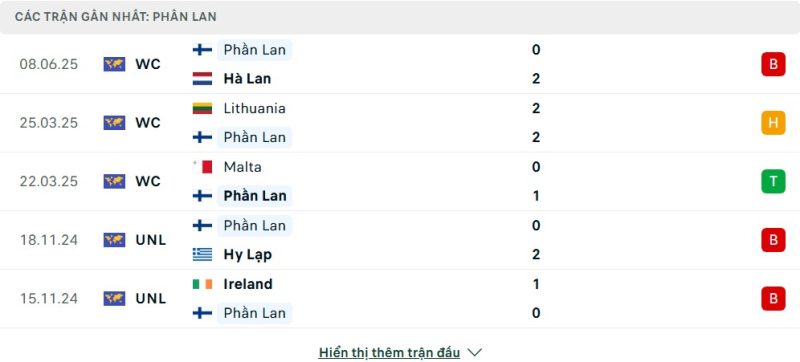 5 trận gần nhất của Phần Lan: L-D-W-L-L