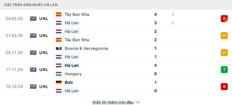 5 trận gần nhất của Hà Lan: D-D-D-W-L