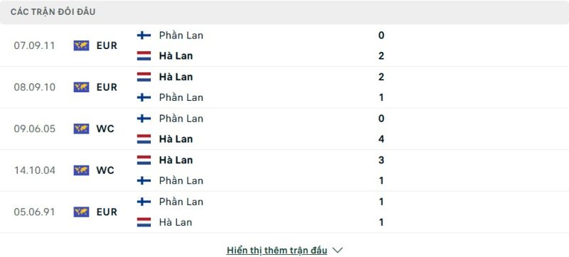 Thành tích đối đầu của Phần Lan vs Hà Lan