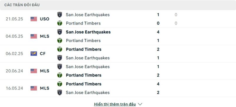 Thành tích đối đầu của Portland Timbers vs San Jose Earthquakes