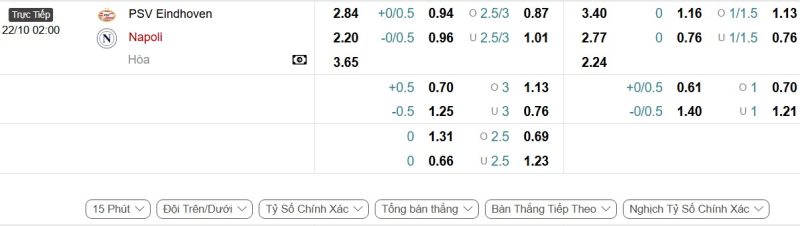Bảng Tỷ lệ kèo bóng đá PSV Eindhoven vs Napoli