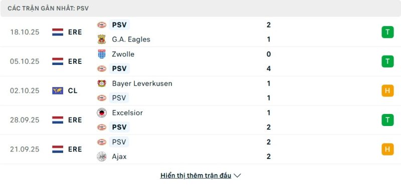 5 trận gần nhất của PSV Eindhoven: W-W-D-W-D