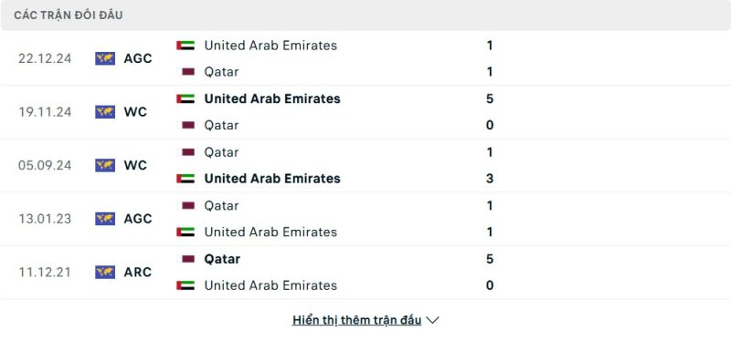 Thành tích đối đầu của Qatar vs UAE