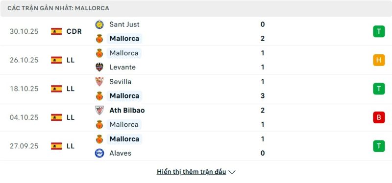 5 trận gần nhất của Mallorca: W-D-W-L-W