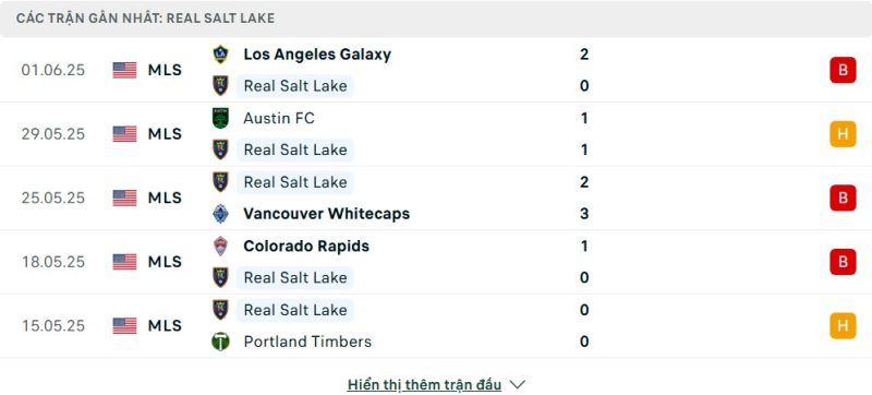 5 trận gần nhất của Real Salt Lake: L-D-L-L-D